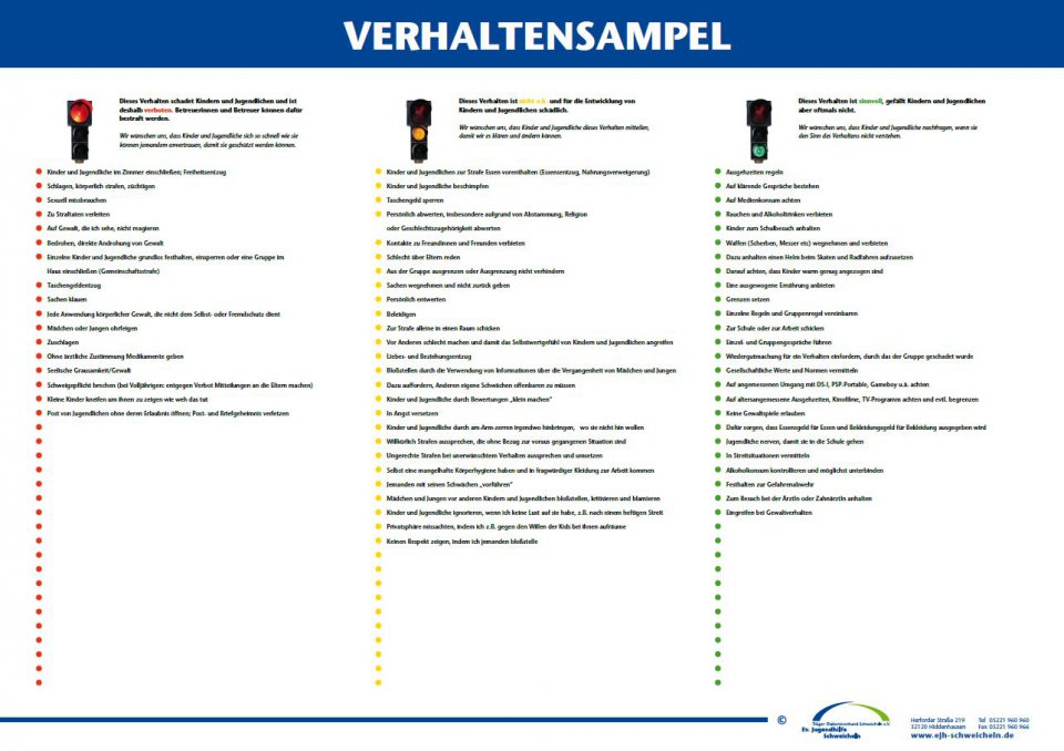 Zum Thema grenzwahrender Umgang im pädagogischen Alltag hat die Ev. Jugendhilfe Schweicheln im Rahmen eines breiten Fortbildungsprojekts unter der Beteiligung von Kindern und Jugendlichen eine „Verhaltensampel“ für Mitarbeitende erstellt.